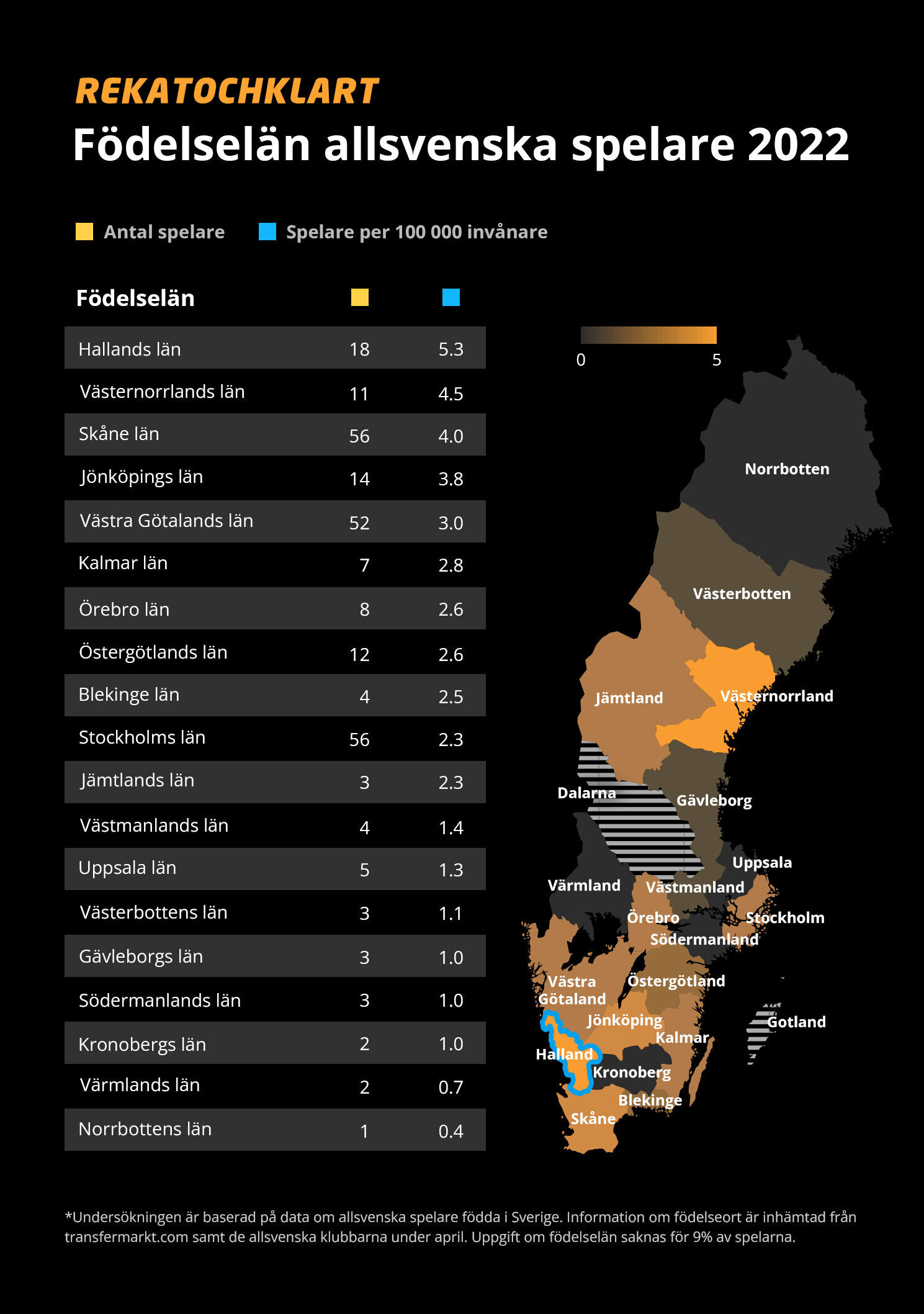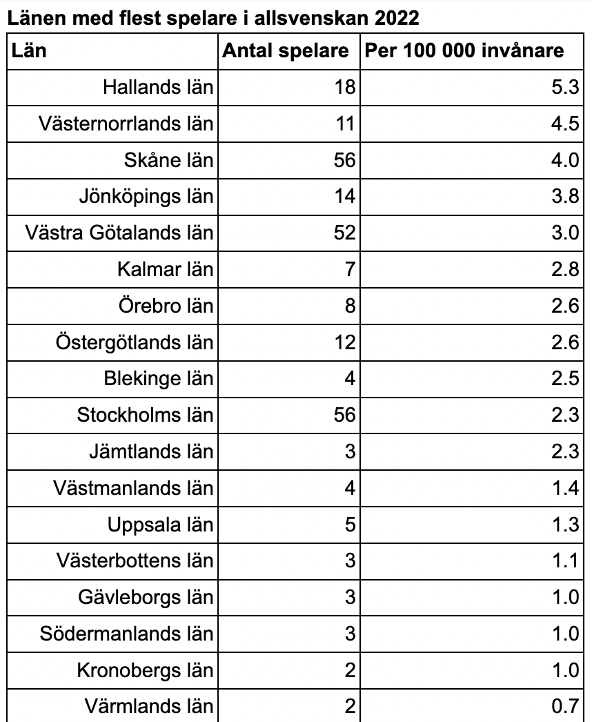 När man tar hänsyn till befolkningsmängd blir resultatet dock ett annat. De län med flest fotbollsspelare per 100 000 invånare i allsvenskan är Halland (5,3), Västernorrland (4,5) och Skåne (4,0). Några av spelarna som är födda i Halland är: Sead Haksabanovic (Djurgården), Edvin Kurtulus (Hammarby) och Alexander Jeremejeff (BK Häcken).