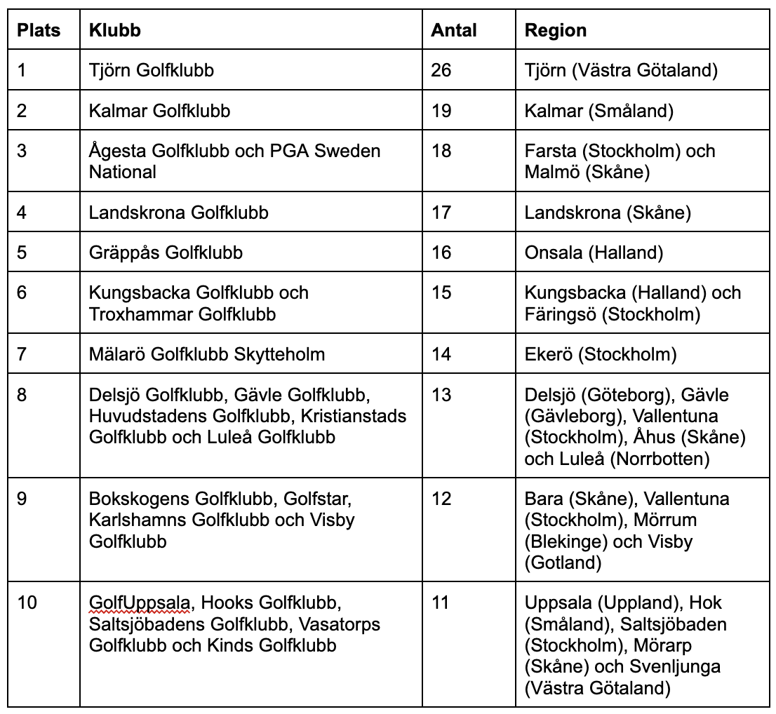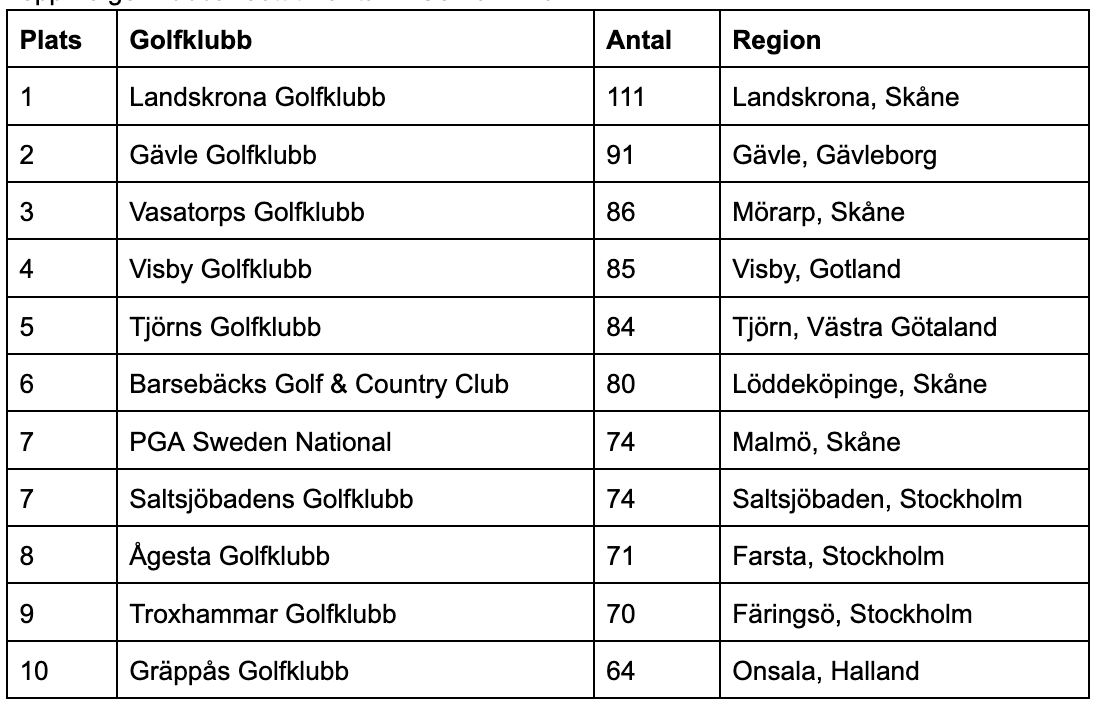 Topp 10 golfklubbar sett till antal HIOs 2021