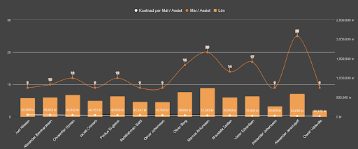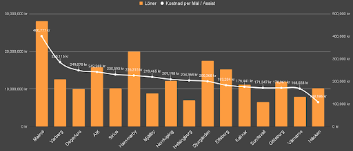 När man slår ihop lönerna och delar summan på antalet mål och assist (ett poäng per mål och ett poäng per assist) visar det sig att fjolårets vinnare BK Häcken hade lägst kostnad per poäng i sin spelartrupp. Det lag som hade högst kostnad per poäng var Malmö FF.