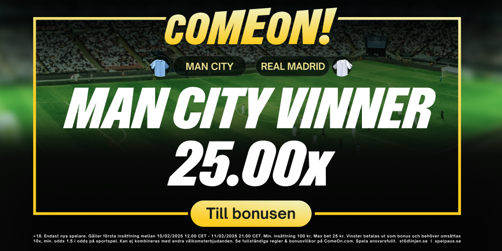 På tisdagskvällen spelas en riktigt fin match i Champions League mellan Manchester City och Real Madrid. Tror du att City vinner så erbjuder ComeOn nya kunder hela 25 gånger pengarna!