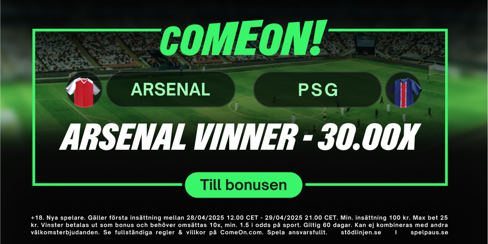Champions League går in i spännande semifinaler och ComeOn erbjuder nya kunder en fin bonus! Om Arsenal slår PSG får du hela 30x pengarna!