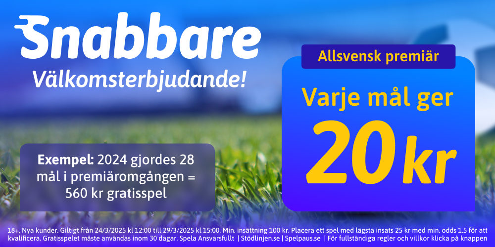 Här kommer ett roligt erbjudande inför den allsvenska starten! Som ny kund hos Snabbare får du 20 kr per mål i gratisspel från premiäromgången!