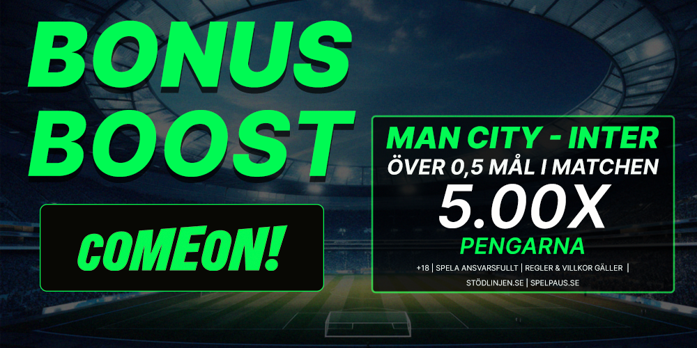 ComeOn erbjuder nya kunder en Bonus Boost där nya kunder får fem gånger pengarna på över 0.5 mål i matchen. Blir det alltså ett enda mål i matchen så går spelet in!