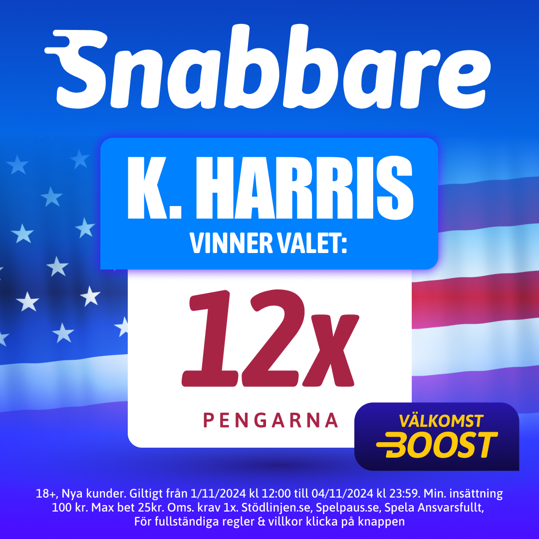 Även Snabbare har ett fint erbjudande - för den som tror på Harris! Om du tror att Demokraternas representant tar hem valet så får du hela 12x pengarna på detta som ny kund hos Snabbare!