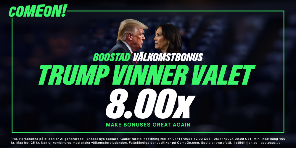Spelbolaget ComeOn har på fredagskvällen Trump att vinna till 1.59 vs Harris 2.37. Den som är ny kund hos spelbolaget får möjlighet att spela Trump till ett rejält boostat odds på 8.00 gånger pengarna! Maxspel är 25 kr och vinner du så får du i så fall 200 kr utan omsättningskrav!