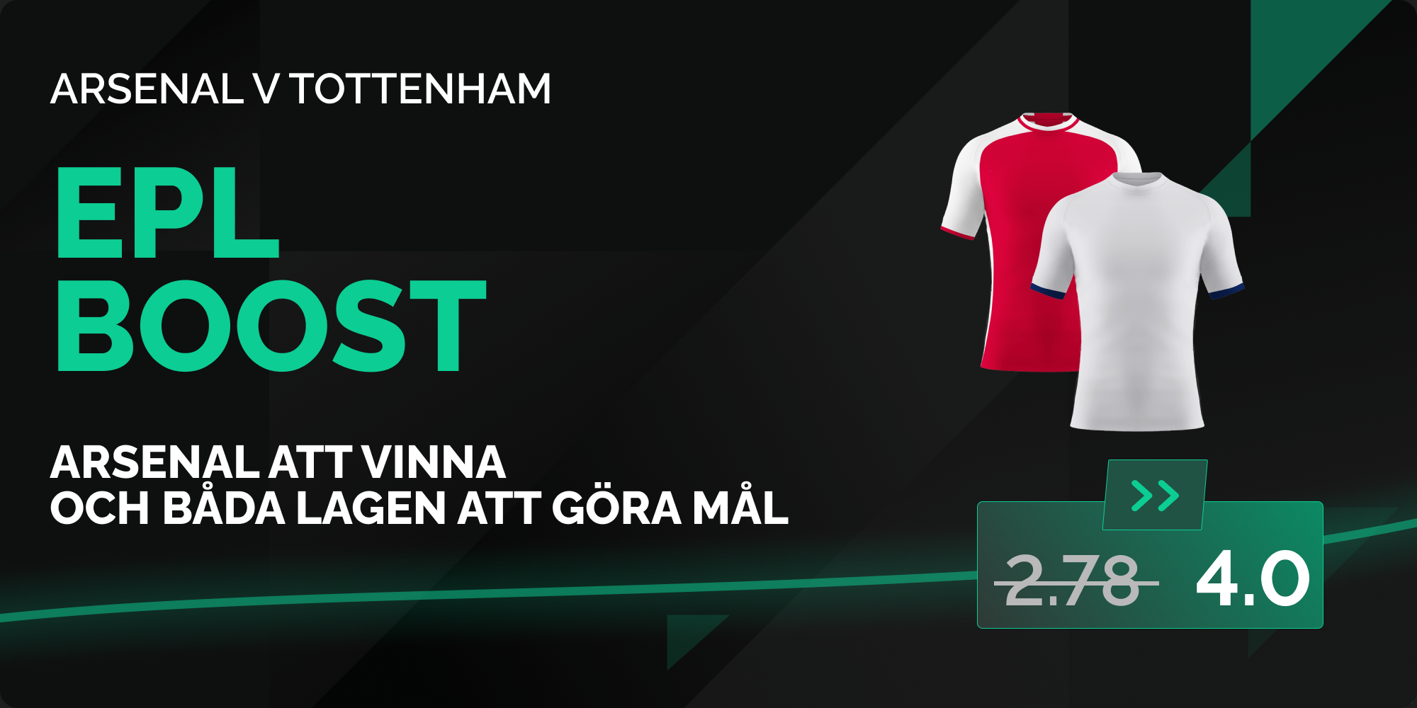 Det vankas veckoomgång i Premier League och onsdagen avslutas på bästa sätt med Arsenal mot Tottenham. Nya spelbolaget SBK erbjuder sina kunder ett boostat odds!