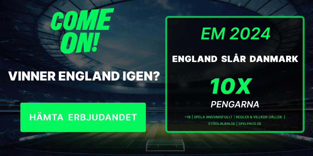 En av de största favoriterna till att vinna hela EM är England. Nya kunder hos ComeOn erbjuds hela tio gånger pengarna i oddsboost på att de slår Danmark!