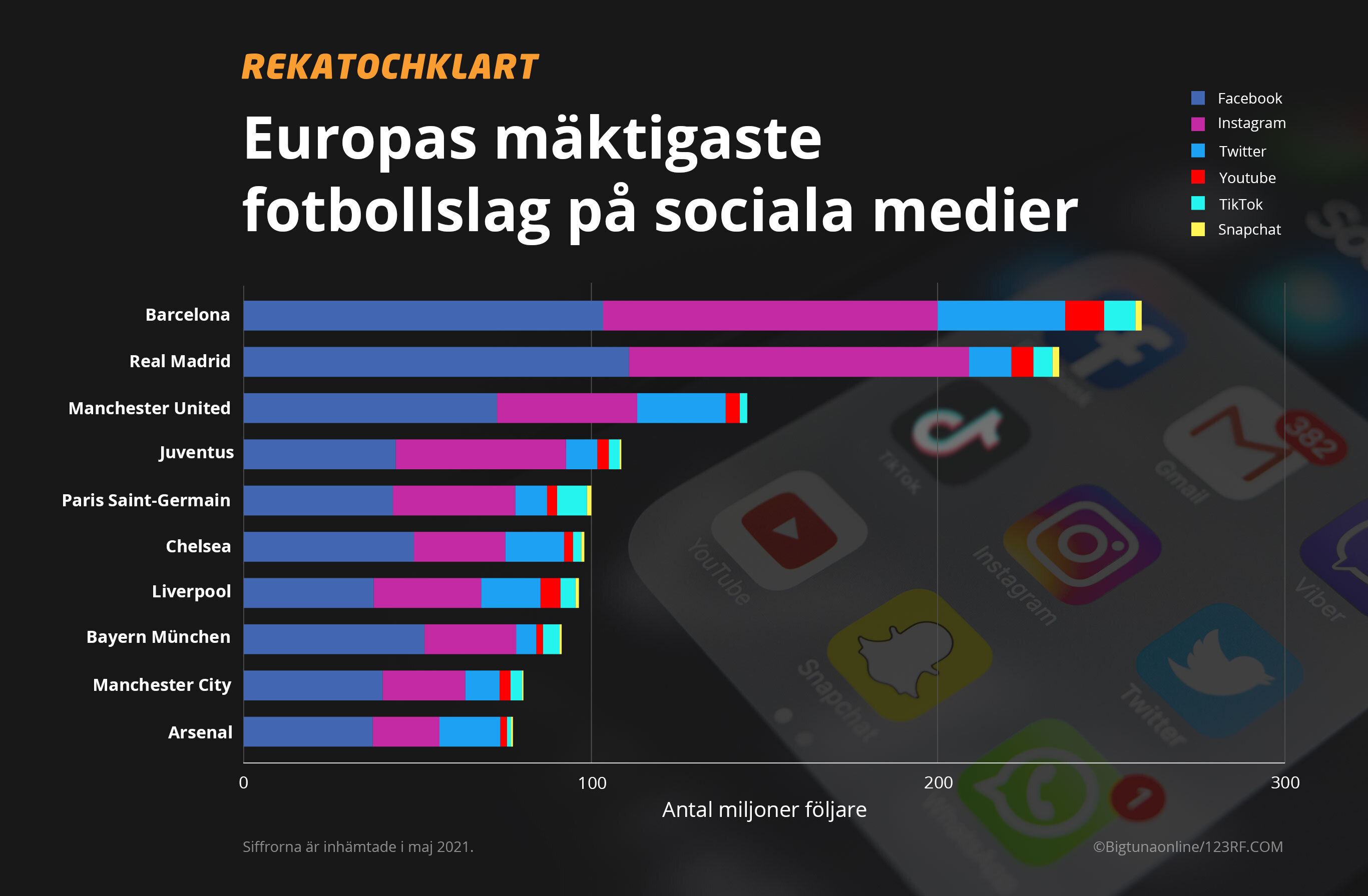 I toppen av listan hittar vi Spaniens giganter i form av Barcelona och Real Madrid som vardera har fler än 200 miljoner följare. En stor del av båda lagens följare finns på Facebook och Instagram, men också Twitter och Youtube. Barcelona har dessutom fler än dubbelt så många följare på Tiktok som är en växande social media, där främst yngre personer spenderar tid.