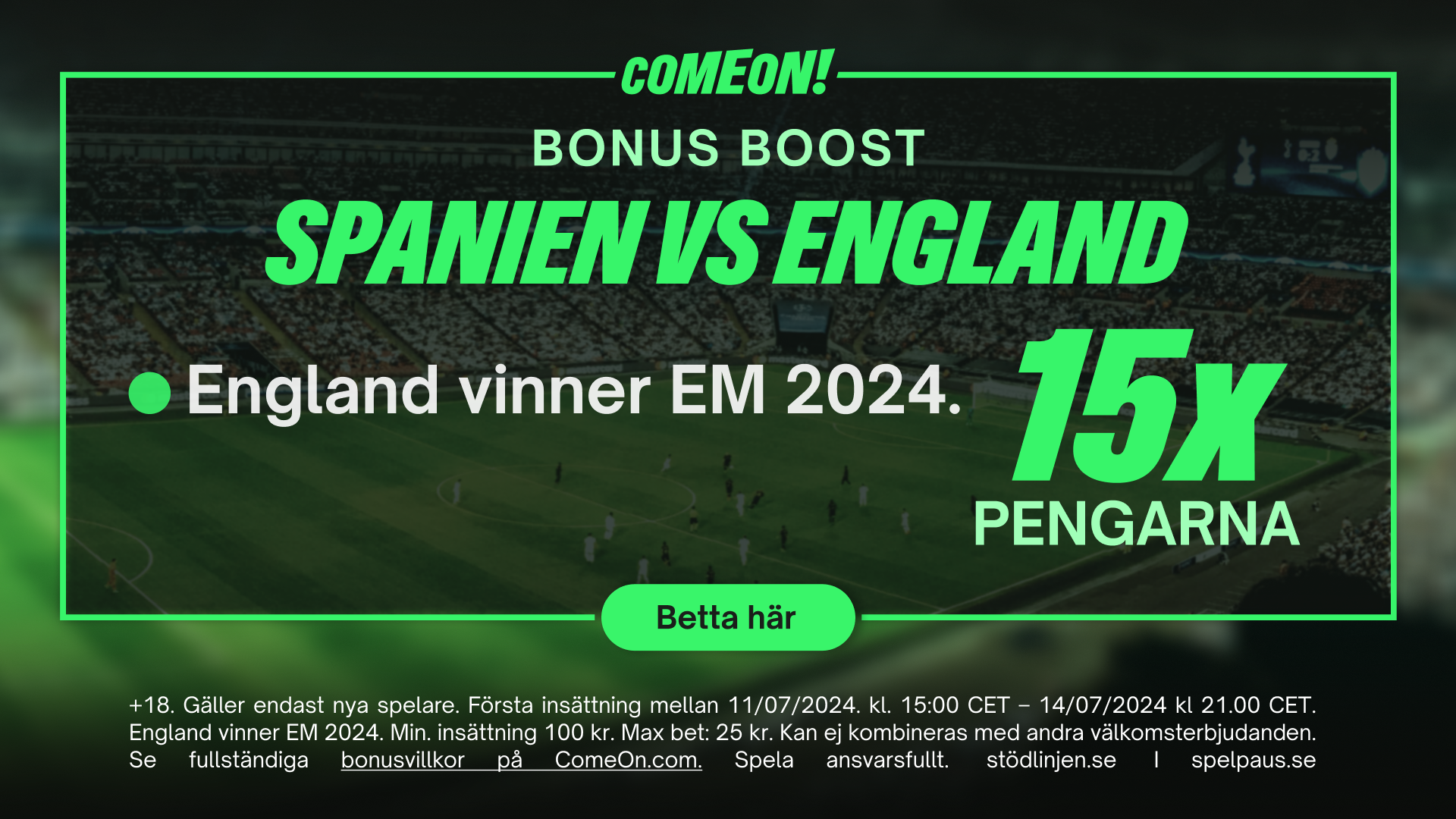 Hela världens fotbollsälskare blickar fram emot söndag kl 21:00 när EM-finalen mellan Spanien och England ska avgöras. Tror du på att "It's coming home?" så får du som ny spelare hos ComeOn en finalboost på hela 15x pengarna på England!