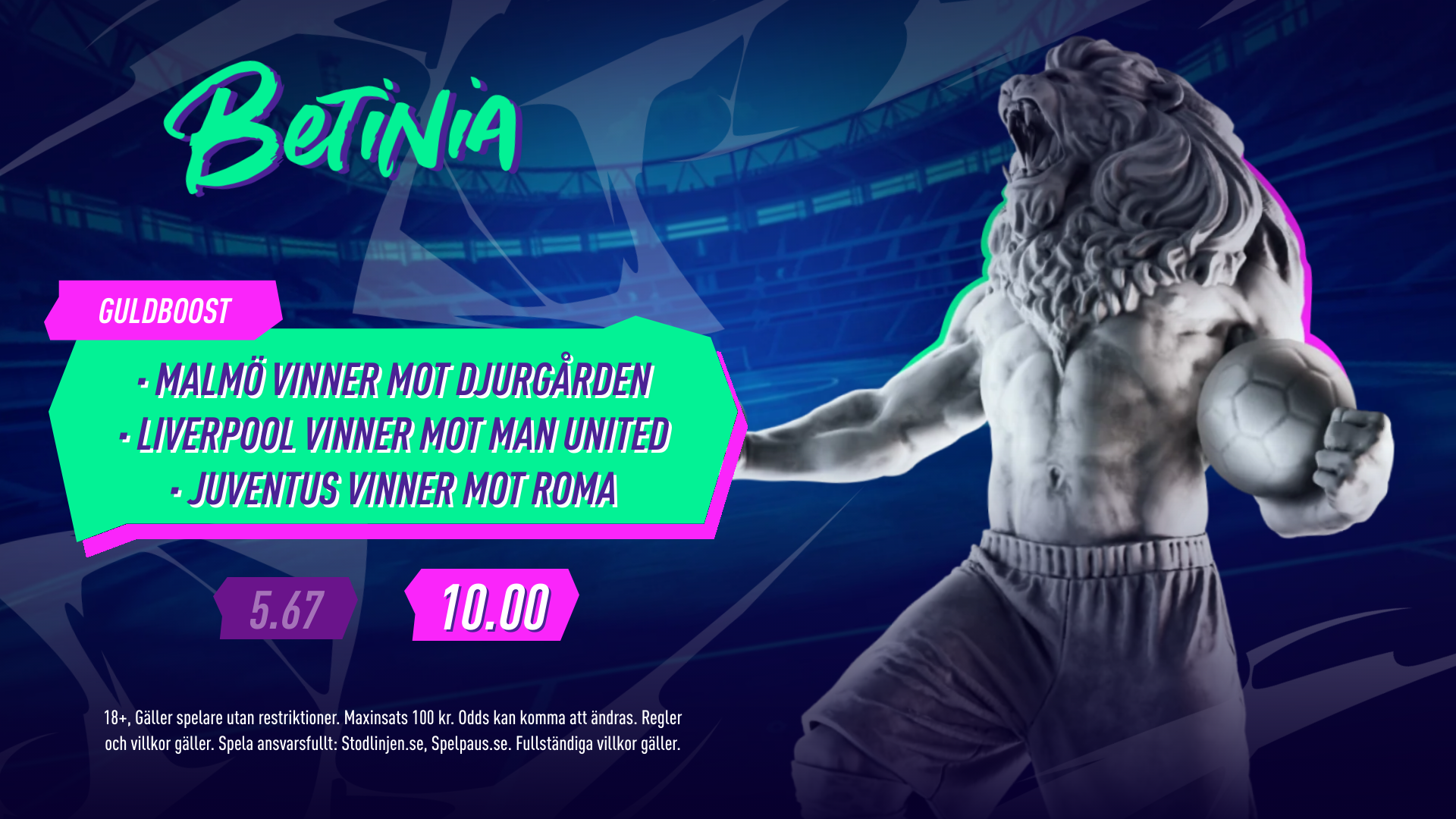 Vi väntar oss en riktigt fin fotbollshelg med flera stormöten på agendan! Betinia erbjuder alla kunder en "Guldboost" med nästan dubbelt så högt odds.