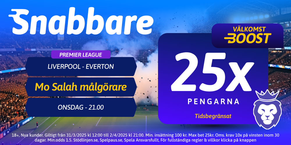 Egyptiern har stänkt in hela 27 mål i Premier League den här säsongen och är med det i klar skytteligaledning före Haaland på 21 mål och Isak på 19 mål. I sin senaste ligamatch gjorde Salah två straffmål mot Southampton och gör han mål mot Everton så erbjuder spelbolaget Snabbare hela 25 gånger pengarna.