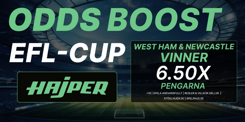 Ikväll spelas den engelska ligacpen (EFL-cup) och i samarbete med Hajper har vi fått till oss en riktigt fin odds boost - från knappt 4.00 gånger pengarna till 6.50!