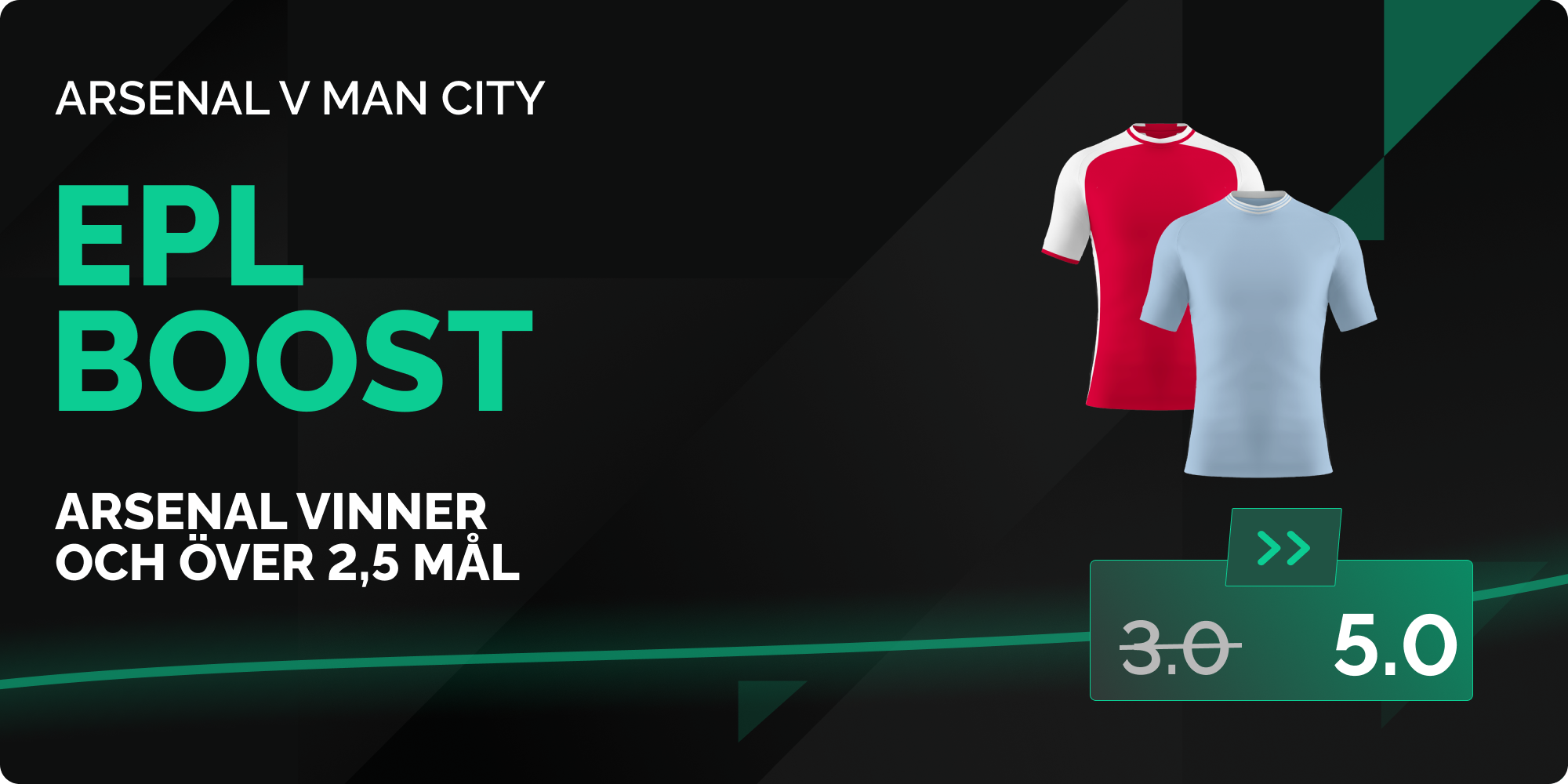 SBK boostar oddset för ALLA kunder på att Arsenal vinner och att det blir över 2.5 mål i matchen. Ordinarie odds är 3.00 och nu får man istället hela 5.00 på samma spel.