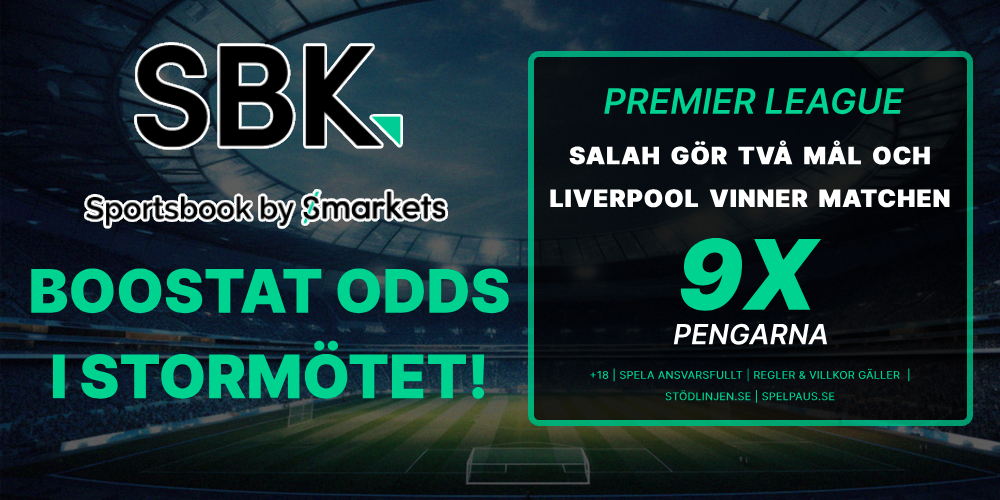Mohamed Salah att göra två mål mot Tottenham och att Liverpool vinner matchen? Tror du att detta slår in så boostar SBK upp oddset från 6.40 till 9.00 gånger pengarna!