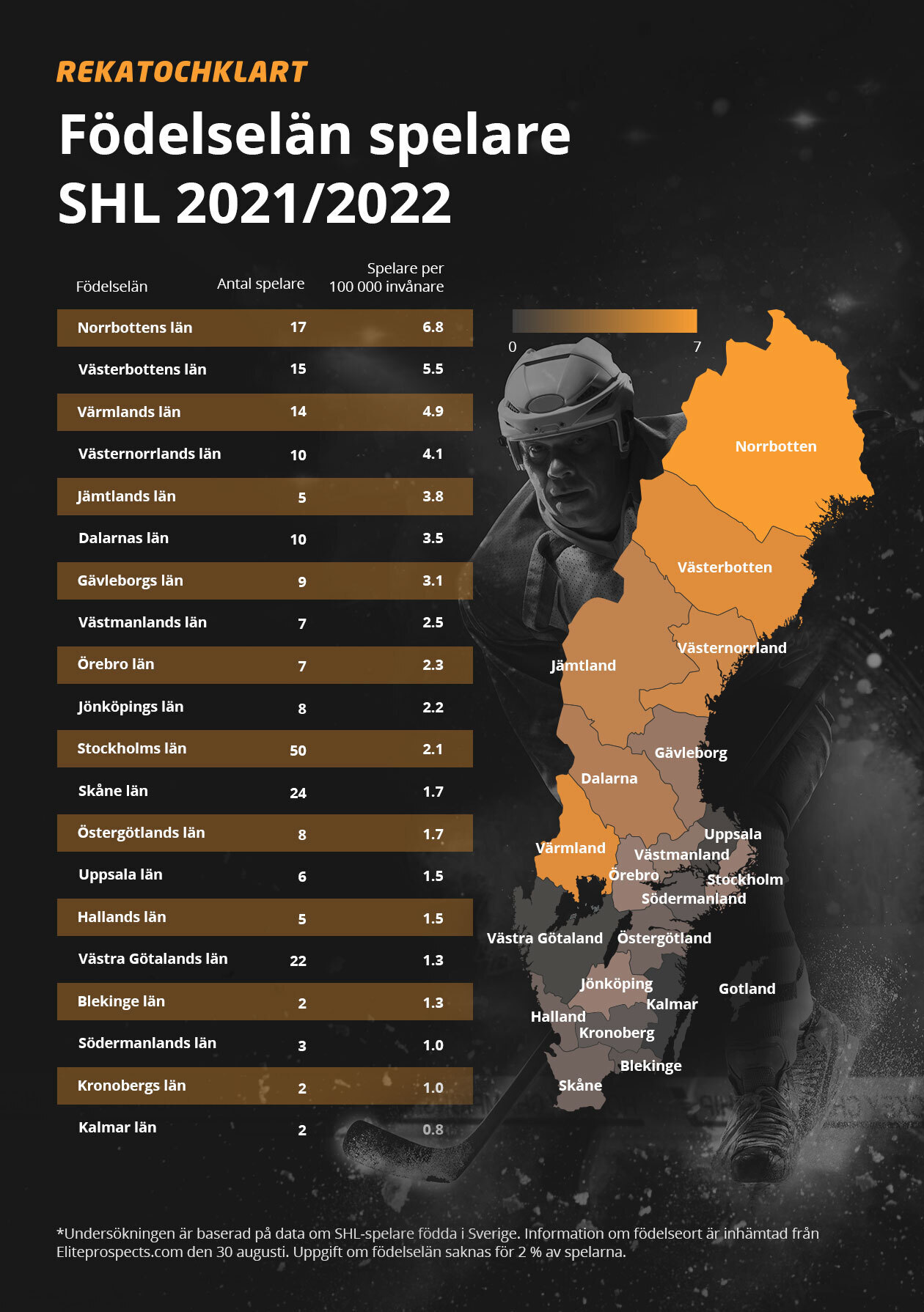 Det är därmed inte de stora ishockeydistrikten med många invånare som får fram flest talanger i Sverige, både Skåne och Stockholm ligger på den nedre halvan av tabellen. Länet som sticker ut mest är Västra Götaland som endast har 1.3 spelare per hundratusen invånare, vilket är lite förvånande med länets storlek och att man har storklubben Frölunda HC som en av de stora klubbarna i Göteborg.
