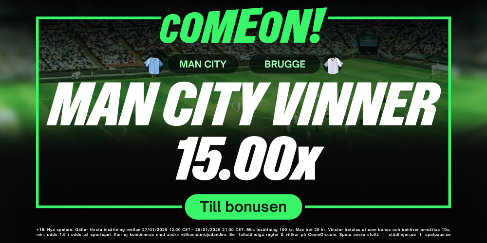 ComeOn har lastat fram en riktig superdeal inför att gruppspelet i Champions League skall avslutas. Nya kunder hos spelbolaget får hela 15.00 gånger insatsen på att Manchester City lämnar planen med seger i mötet mot Club Brugge.