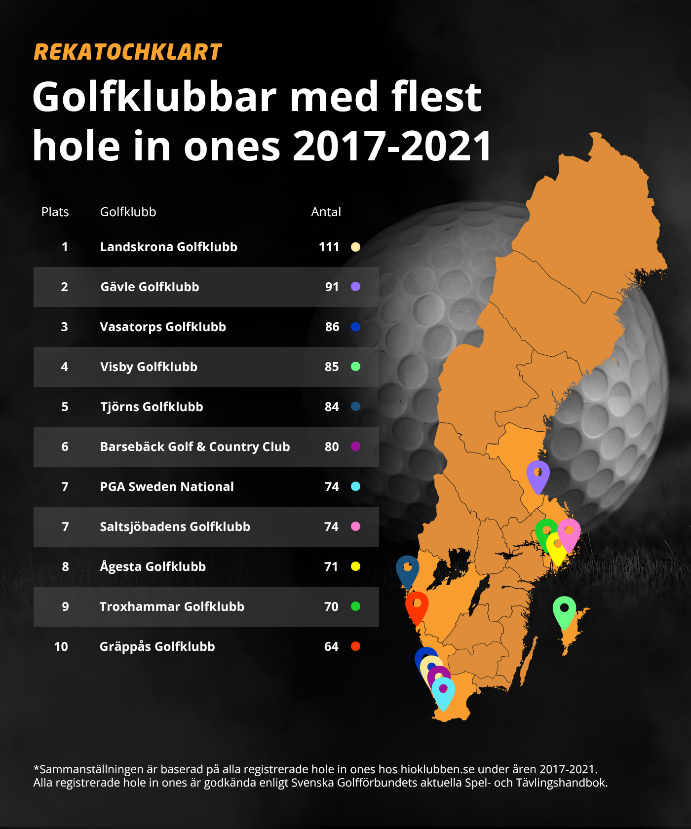 En genomgång av registrerade hole in ones under åren 2017-2021 visar att det slogs flest sådana på Landskrona Golfklubb i Skåne. Ungefär 1,4% av alla slagna hole in ones under dessa år noterades ha utförts där.